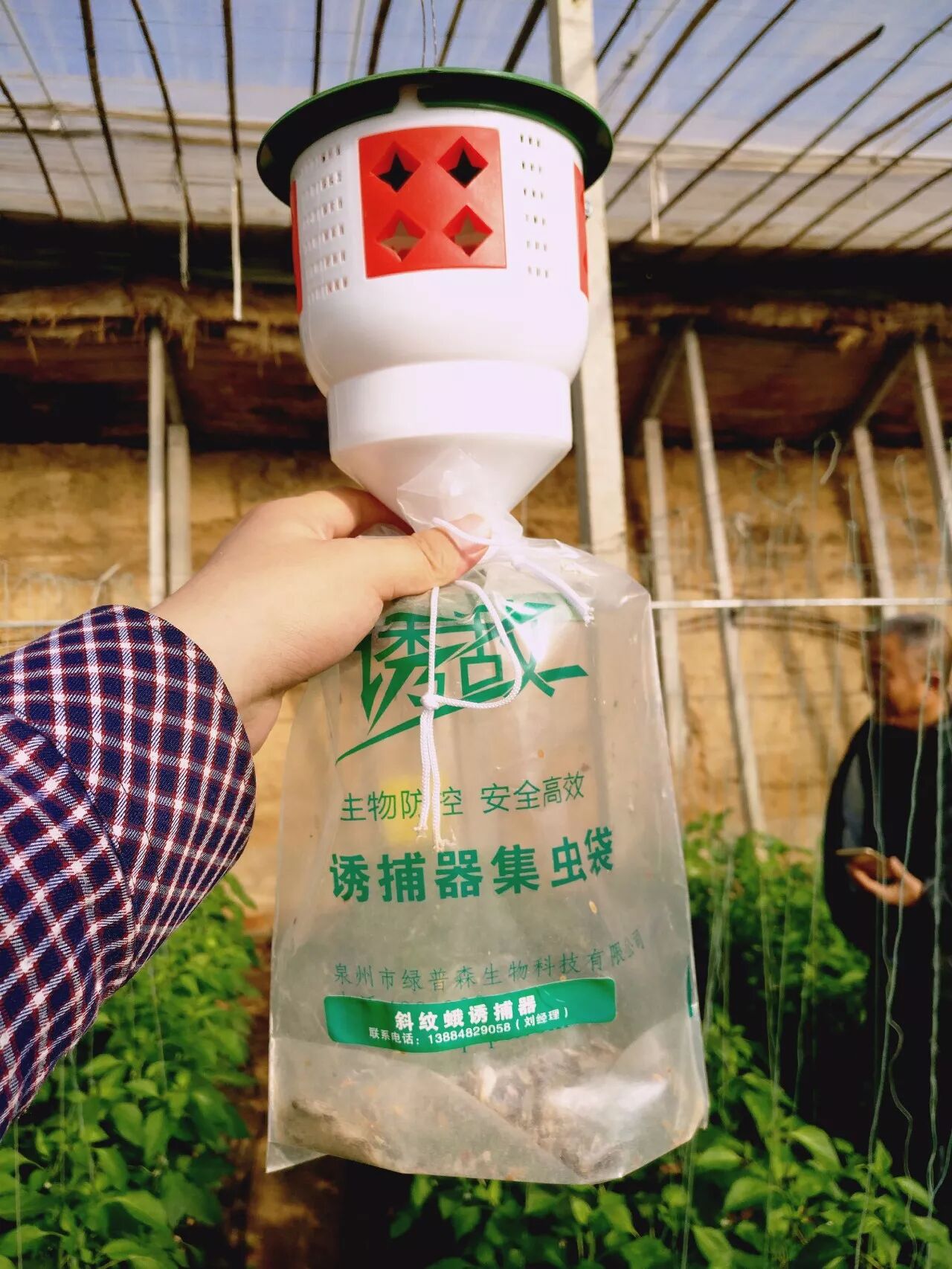 “我这已经清理过一次了,9、10月份天凉了,外边的虫子都往棚里飞,没多长时间袋子里蛾子就满了,现在天冷了,虫子少多了。”当地菜农任明祥介绍道,“过几个月到了虫子多的时候,再换个诱芯就行,十块钱一个,还不到一桶杀虫剂的钱,还省的背着个喷雾器来回喷药,省事多了。这个诱捕器真不错,今年秋季开始推广,几乎家家户户都开始用了。”