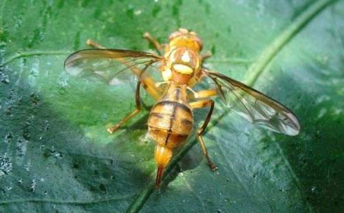 据了解,柑桔实蝇成虫长约8mm,翅展约16mm,体色黄褐,胸有黄色纵带纹。翅膜质透明,杂有暗褐色斑纹,腹部有黑色纵带纹,腹末端产卵器像针刺。幼虫蛆形,乳白至乳黄色,具有光泽,3龄时长约14-16mm,老熟时15-19mm,前端尖细,后端肥大。口钩黑色,常缩入前胸内,在果实中蛀食为害。